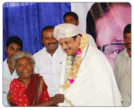 A senior citizen and midday meal beneficiary felicitating Mr. Mohsin Shariff in appreciation of his service to the underprivileged.